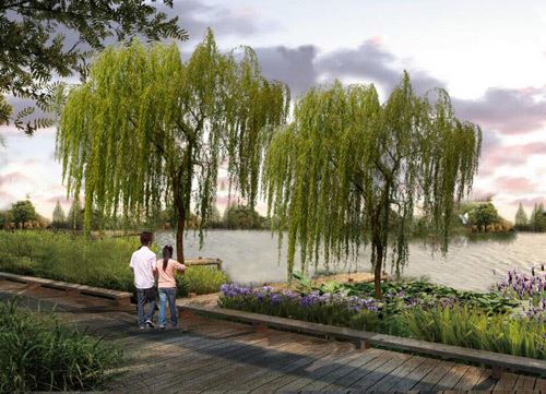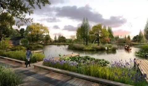 以荷花為主題,堤岸打造木棧道,河岸搭配蘆葦等植物,充分發揮綠地效益。
